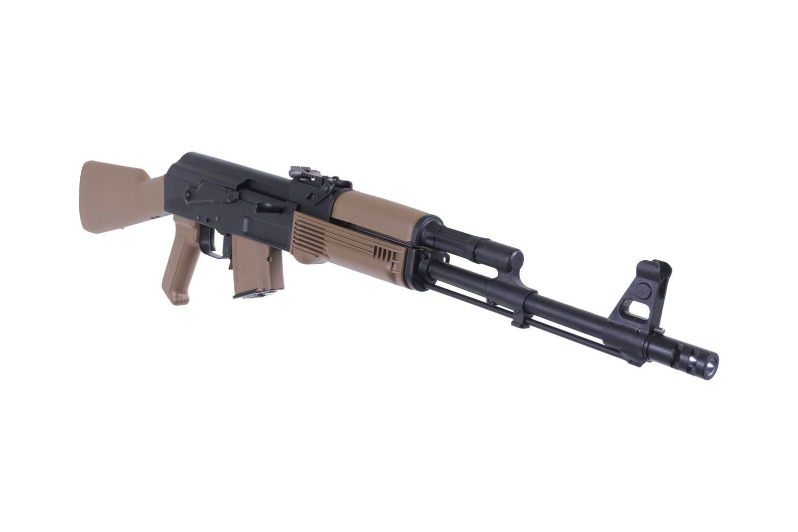 Arsenal SAM7R-62 7.62x39mm Semi-Automatic Rifle with FDE Furniture and FDE 10rd Magazine. Includes AK-351 Muzzle Brake milled and forged receiver FIME Group enhanced fire control group 16.3″ chrome lined hammer forged barrel 14x1mm left-hand threads removable muzzle brake cleaning rod bayonet lug black polymer furniture intermediate length buttstock scope rail one FDE 10 round magazine sling oil bottle and cleaning kit.