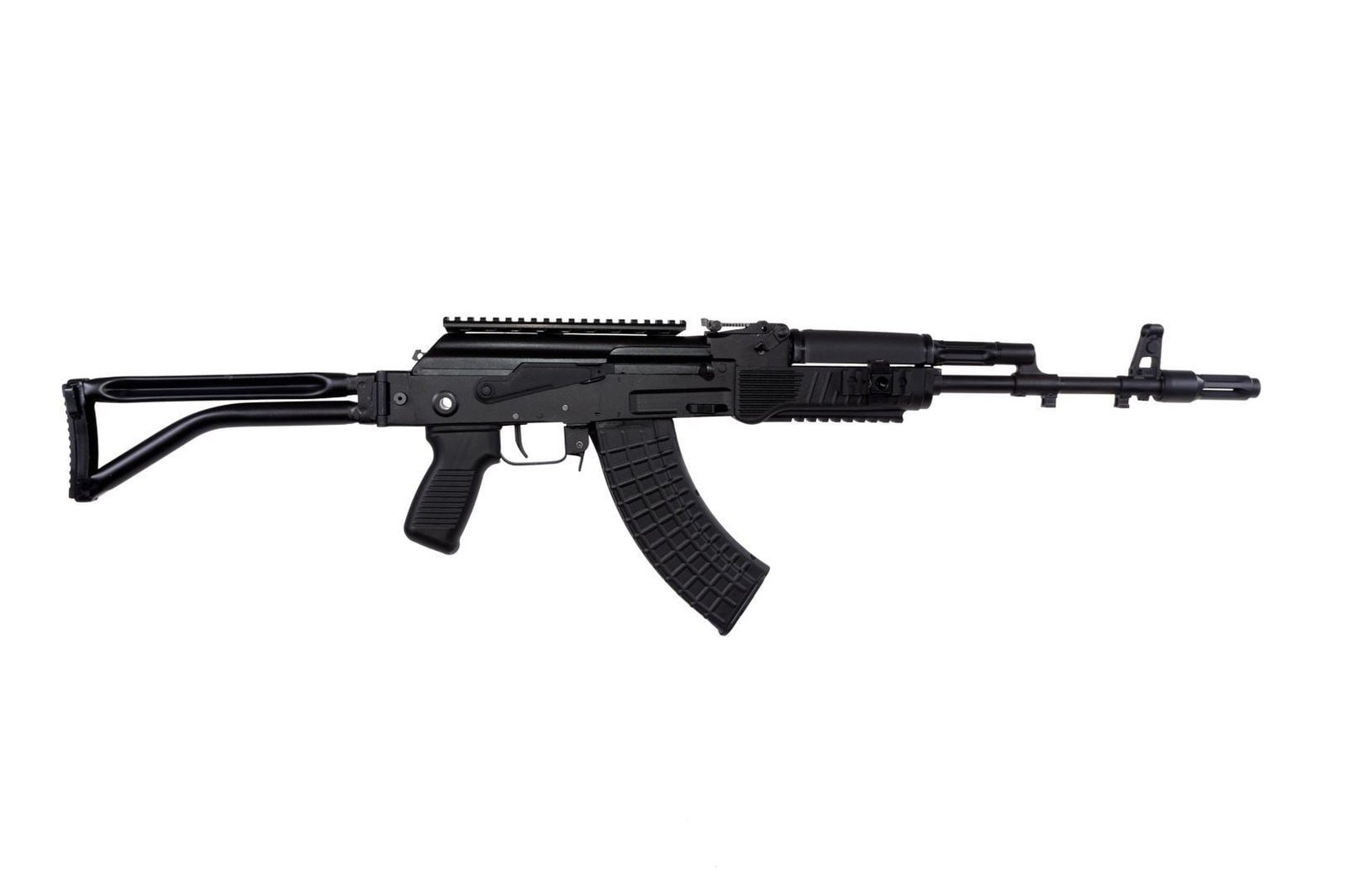 Arsenal SAM7SF 7.62x39mm milled and forged receiver semi-automatic firearm. Includes FIME Group enhanced fire control chrome lined hammer forged threaded barrel 24×1.5mm right hand threads flash hider bayonet and accessory lugs right-side folding tubular buttstock black polymer pistol grip and handguards with stainless steel heat shield ambidextrous safety lever scope rail sectional cleaning rod one 30-round magazine sling oil bottle and cleaning kit.