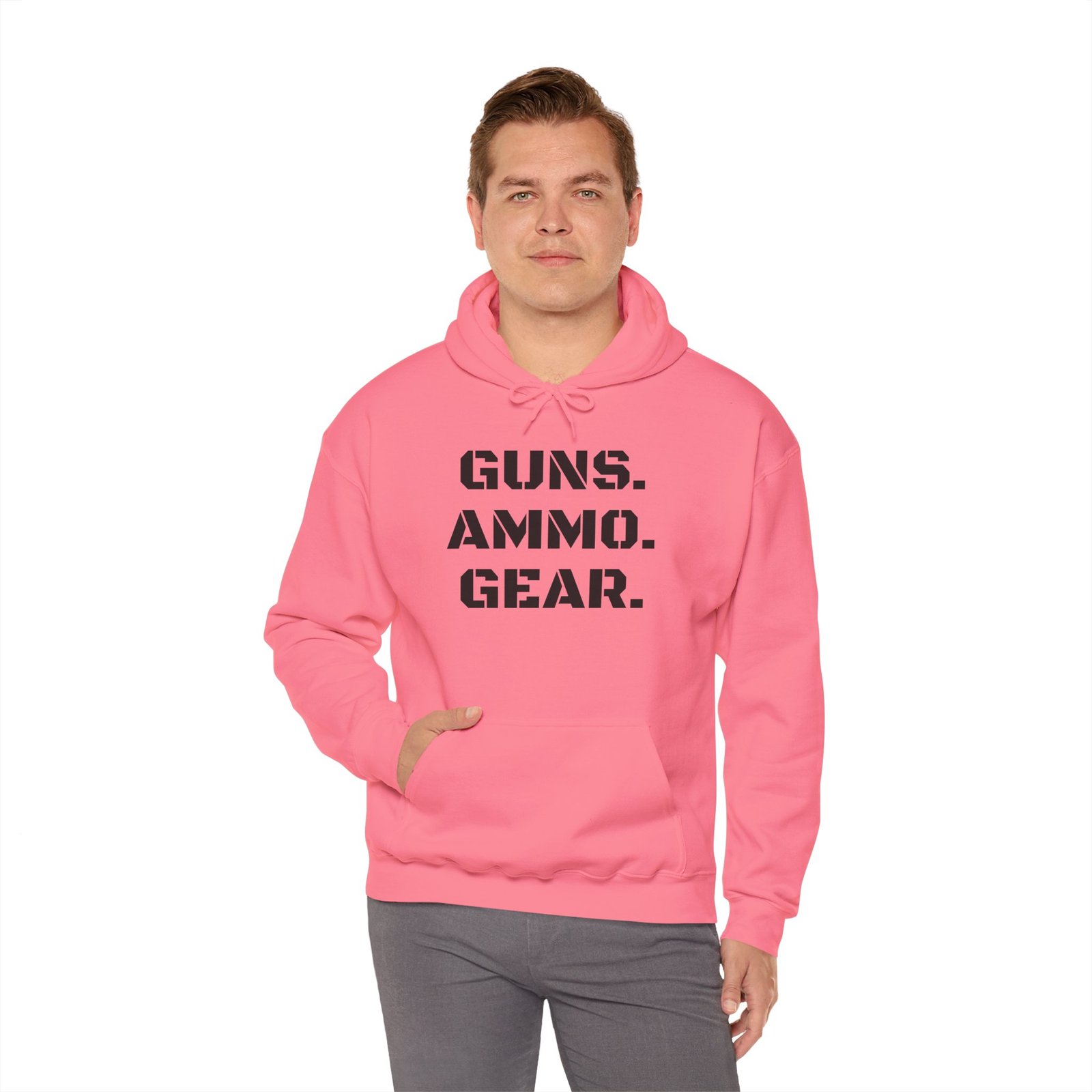 A rugged, no-nonsense hoodie made for those who value function and straightforward style. The soft, medium-heavy fabric holds shape and print with ease, while the kangaroo pouch and double-lined hood add everyday practicality. Front text reads in bold stencil lettering and the back features a crisp target emblem—subtle, confident branding that fits into a shooter’s kit or a casual layering rotation. Wear it to the range, a gear meet-up, or on cool mornings when you’re loading up the truck. It settles in comfortably and keeps the focus where it belongs: on the mission, not the outfit.