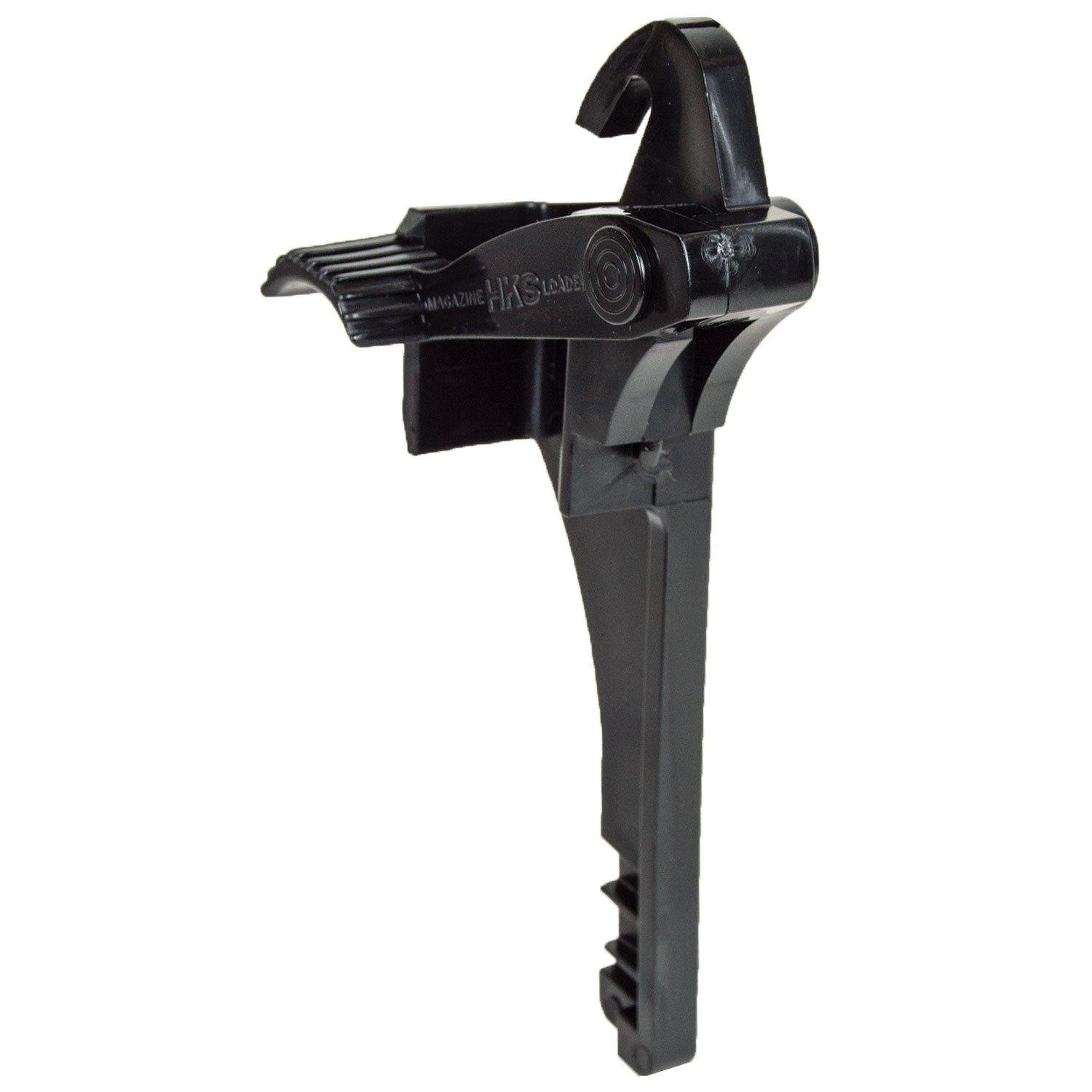 Thumb operated Lever Arm is secret to Fast-Easy operation of this HKS Magazine Speedloader. Capable of loading 15 rounds in 18 seconds. Works equally well right or left handed.